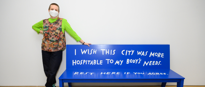 Finnegan Shannon (geboren 1989 in Berkeley, Kalifornien) ist ein*e Künstler*in, der*die mit Formen des Zugangs experimentiert. Mit Humor, Ernsthaftigkeit und Wut greift Finnegan Shannon in behindertenfeindliche Strukturen ein. Zu ihren*seinen jüngsten Arbeiten gehören „Alt Text as Poetry“, eine Zusammenarbeit mit Bojana Coklyat, die das Ausdruckspotenzial von Bildbeschreibungen untersucht; „Do You Want Us Here or Not“, eine Serie von Bänken und Kissen, die für Ausstellungsräume entworfen wurden, und „Don’t mind if I do“, eine Ausstellung mit einem Förderband im Mittelpunkt, die Ruhe und Spiel in den Vordergrund stellt. Finnegan Shannon hat Projekte mit dem MUDAM Luxemburg, dem Queens Museum, dem moCa Cleveland, der High Line, dem MMK Frankfurt, dem MCA Denver und der Nook Gallery durchgeführt. Ihre*seine Arbeit wurde durch den Wynn Newhouse Award, ein Eyebeam-Stipendium, ein Disability Futures Fellowship, ein United States Artists Fellowship und Stipendien der Art Matters Foundation, des Canada Council for the Arts und des Disability Visibility Project unterstützt. Über ihre*seine Arbeit wurde in Art in America, BOMB Magazine, The Believer und Out Magazine berichtet. Finnegan Shannon lebt und arbeitet in Brooklyn, New York.