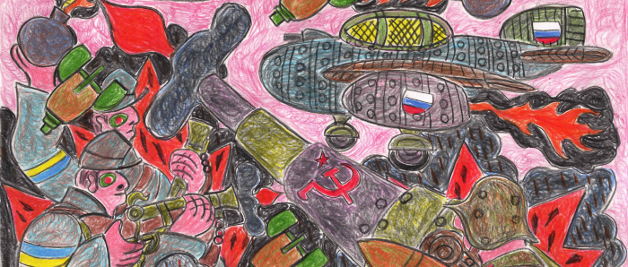 Aus gegebenem Anlass haben wir uns entschieden, die geplante Ausstellung DREIFACHBÜRGER UND ANDERE GERICHTE abzusagen. Anstatt zeigen wir aktuelle Buntstift-Zeichnungen von Andreas Maus zum russischen Angriffskrieg auf die Ukraine. Im Kontrast dazu steht eine neue Serie abstrakter Tusche-Zeichnungen, die in den Pausen zwischen Maus' expliziten Kriegsdarstellungen entstanden. Sie können als Ausdruck der Sprachlosigkeit verstanden werden, die dieser Krieg mit seinen schrecklichen und gewaltvollen Bildern in uns auslöst.
